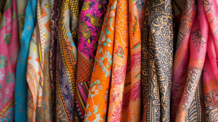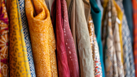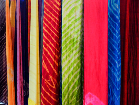 variegated multi colored fabrics in the Indian traditions at the exhibition
