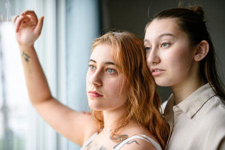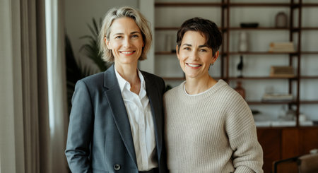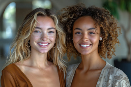 Two beautiful young women express their love for each other with warm smiles and tender hugs, celebrating their bond in a cozy setting. This moment captures pure happiness.