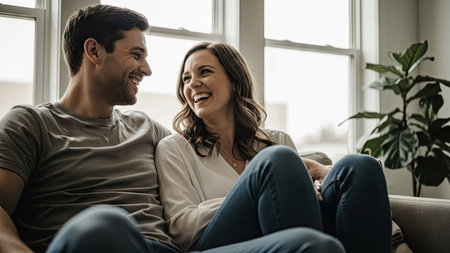 A man and woman are seated closely on a sofa, sharing a joyful moment. Natural light floods the scene, illuminating their faces and highlighting the soft textures. The composition suggests an intimate setting, with a window and a houseplant visible. This image may be suitable for various commercial or editorial applications.