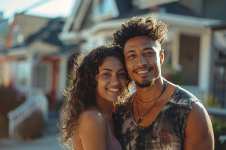 A lower middle-class mixed-race couple is standing in front of a row of houses. The man and woman appear to be observing the neighborhood. The houses behind them are neatly aligned.