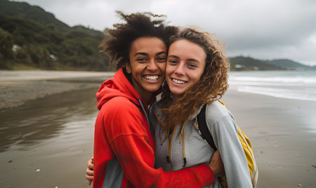 Two diverse young women, exuding happiness and friendship on a soft background. AI generative.