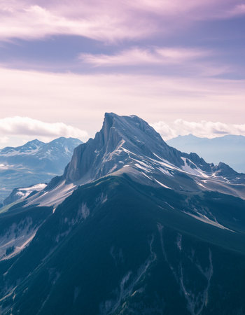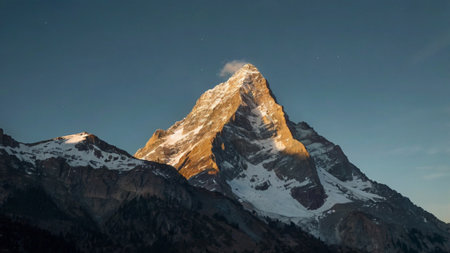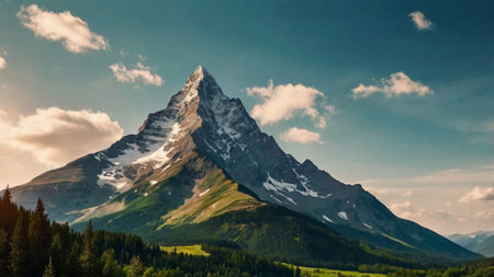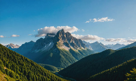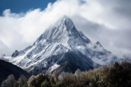 snow-covered peak towering above alpine valley, with clouds floating by, created with generative ai