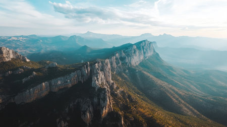 Bird's-eye view of a mountain range with dramatic cliffs, with ample sky space for text