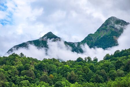 Mountain landscape with fog and clouds in the morning. Caucasus, Russia