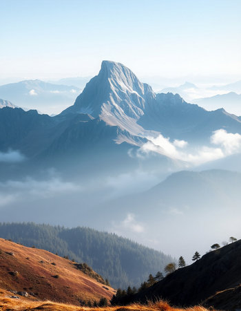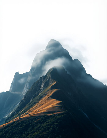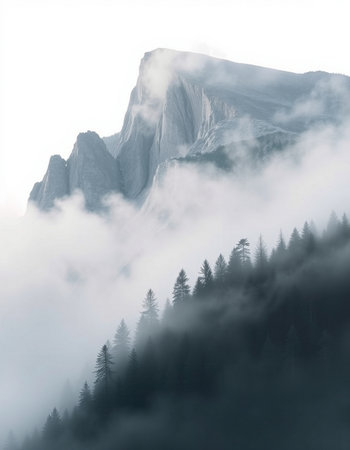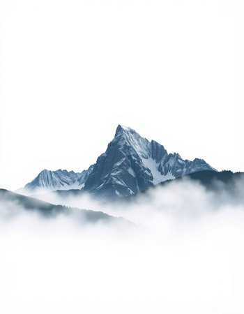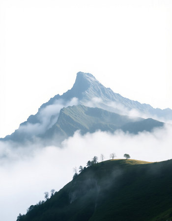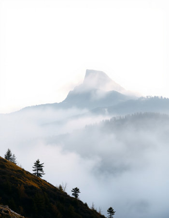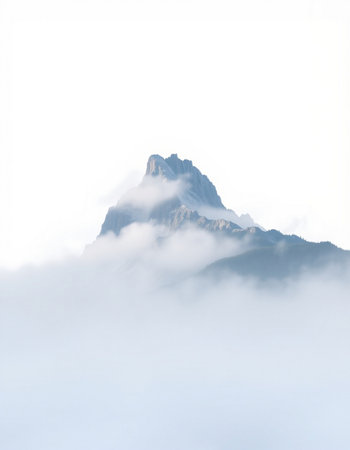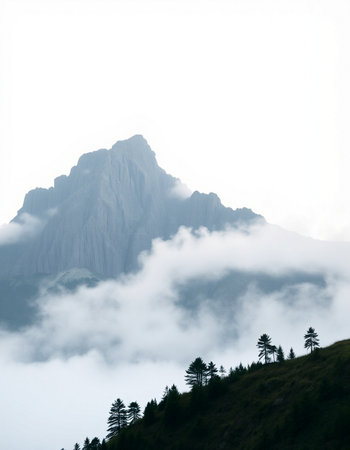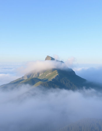 A stunning view of a solitary mountain peak enveloped in mist and fog. The serene landscape embodies tranquility, making it perfect for nature enthusiasts and wanderers.