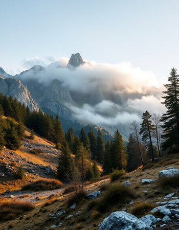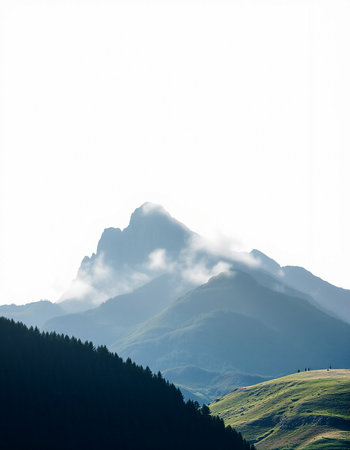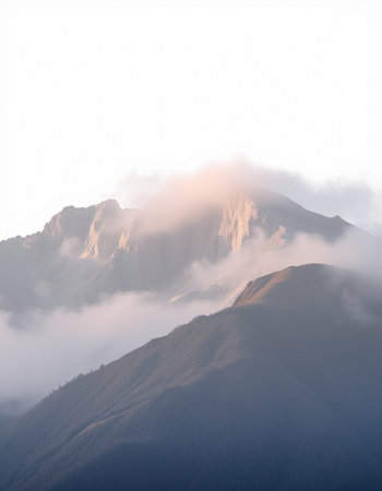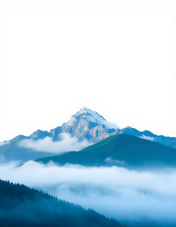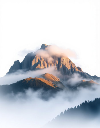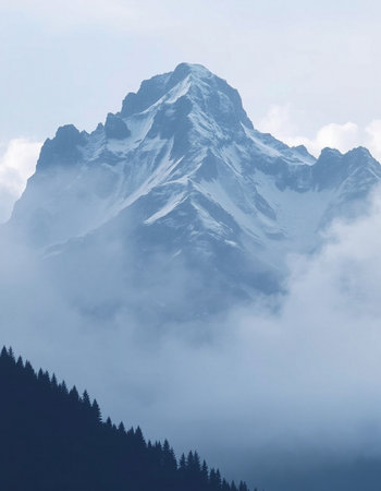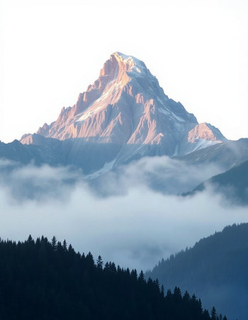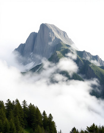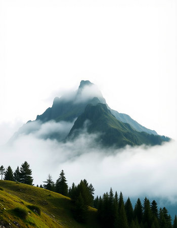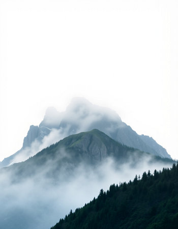 This captivating image showcases a majestic mountain peak shrouded in mist, set against a tranquil forest backdrop, invoking serenity.