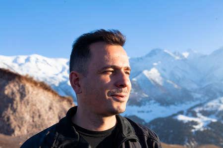 portrait of a brutal young man, dark-haired 36 years old in a sports jacket, against the background of the snow-white mountains of Tien Shan