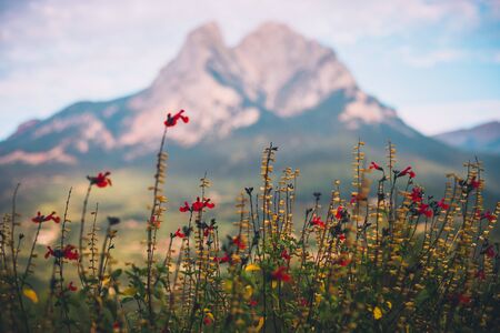 Red flowers with blurred Pedraforca mount in the background in Cadà national park in Catalonia, SPAIN.