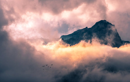 Sunset in the mountains with clouds and birds on the sky.