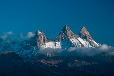 Mountain landscape with snow and fog in Himalayas, Nepal