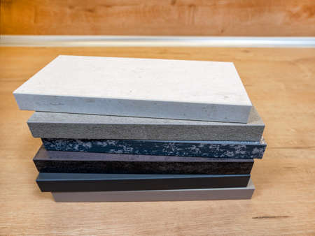Close up combination of interior material containing set of artficial stone and wooden veneer samples. quartz stone and wooden laminated samples palette background. kitchen countertops color samples.