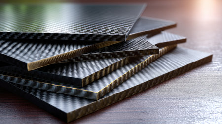 Stack of textured carbon fiber sheets resting on a wooden surface, showcasing the material