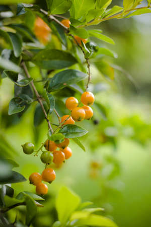 Duranta Erecta bush background, a tropical plant with yellow berries