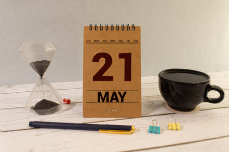 May 21st. Image of may 21 wooden color calendar on white background. Spring day, empty space for text
