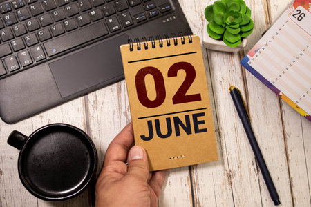 Cube shape calendar for June 02 on wooden surface with empty space for text