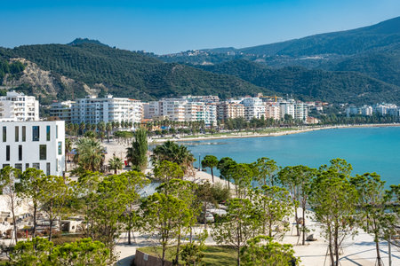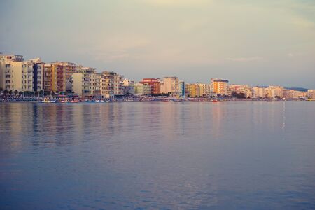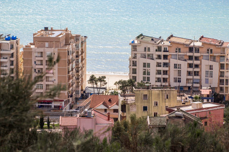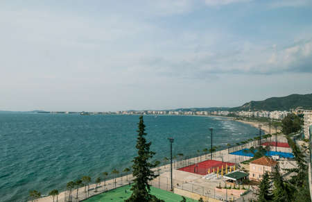 Vlore panoramic city view with seaside and modern architecture Albania. Coastal city on the Adriatic Sea in a Sunny summer day. Residential apartment with flat buildings exterior. Traveling concept