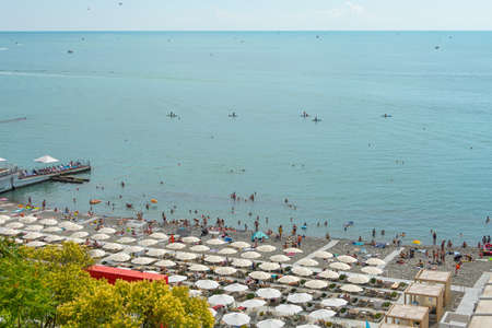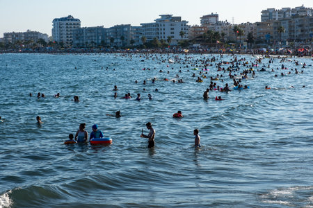 Mersin, Turkey - August 17, 2021: Crowded mediterranean coast during high season