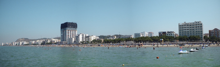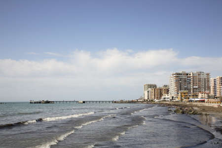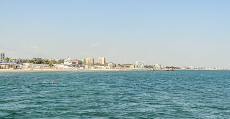CONSTANTA, ROMANIA - SEPTEMBER 16, 2016: The Black Sea, seafront and seaside with blue water and gold sand, hotels.