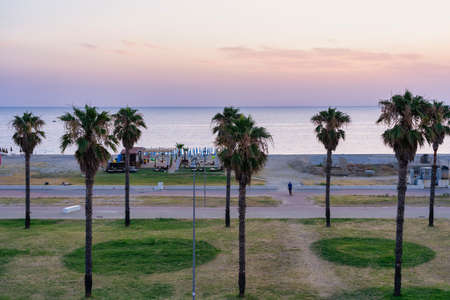 Palm trees at promenade of Batumi, Adjara, Georgia. Path with benches. Silhouettes of palm trees in the sunset light.