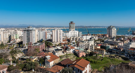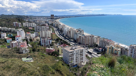 Beautiful coastline of the Albanian town. Scenic view of modern coastal city Durres from mountain view point. High buildings on coast of Adriatic Sea. Albanian Riviera. Travel photo-March 4,2025
