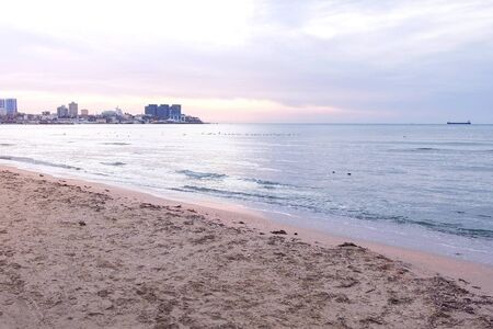 Beautiful seascape at sunset with sea sandy beach and coastal city. Nature and urban background with ocean beach and town witn multi storey buildings.