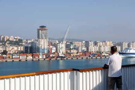Durres, Albania, July 4 2019: Passenger stands on deck and looks at Durres in Albania during the docking maneuver