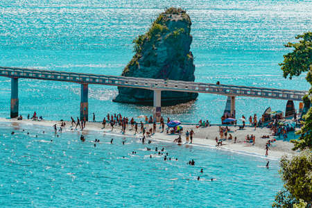Aerial top down view of Bolata Cove on Black sea, Bulgaria. White sand beach on the sea shore near cape Kaliakra. Stones, foaming waves, sunbathing people and colorful boats from above.