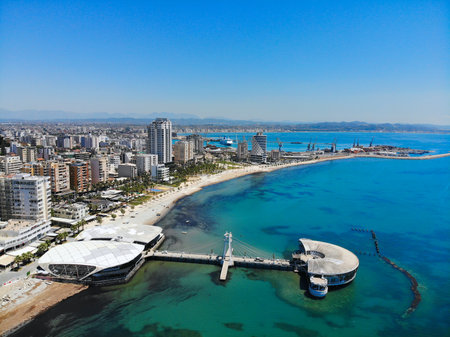 Durres city, Albania. Summer sunny day skyline. Aerial view with coast.