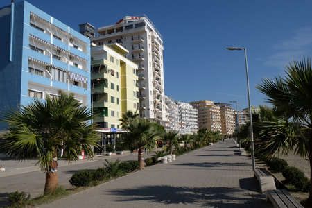 Albania Adriatic sea riviera, shoreline. Sandy beach with hotels and resorts in Durres. Adriatic sea shore in Durres, Albania. Modern architecture in the city. Travel photo