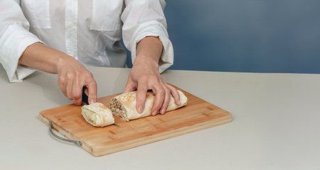 Appetizing shawarma is cut with knife on wooden surface. Woman in white shirt cuts roll with meat and vegetables. concept of cooking fast food at home.