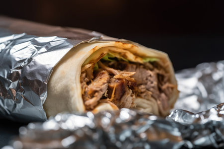 Macro shot of shawarma wrap being wrapped tightly in foil, ready to be enjoyed on-the-go or as a quick and delicious meal, AI Generated