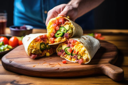 hand serving a cut open breakfast burrito on a wooden board, created with generative ai