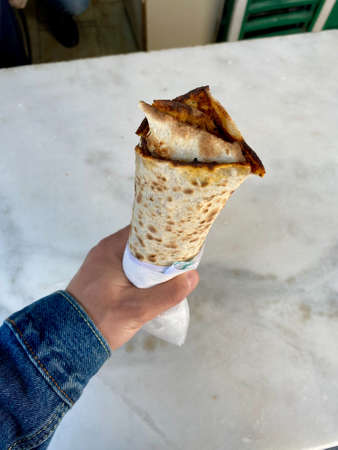Cooking Shawarma. The ingredients are wrapped in pita bread.