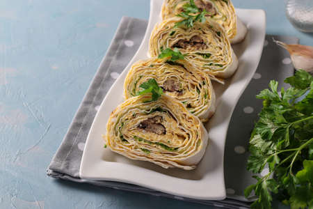 Pancakes stuffed with cheese and herbs on a wooden background.