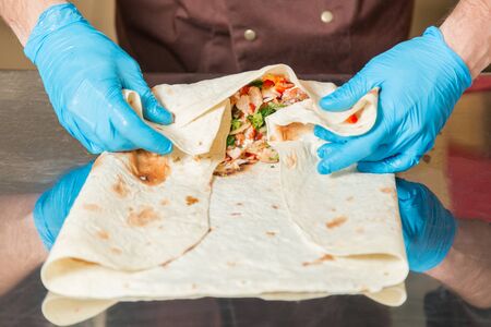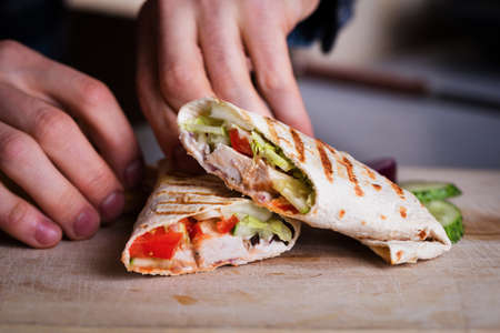 The process of cooking chicken wrap on kitchen table at home concept. Homemade kebab close up. Fresh thin lavash or pita bread roll of shawarma sandwich with ingredients inside.