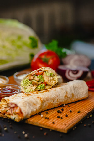 Delicious grilled chicken wrap with fresh vegetables and assorted sauces on wooden board.