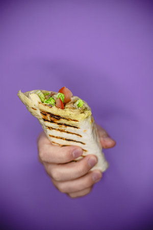 Hand holding fresh grilled wrap with avocado and tomato against purple background.
