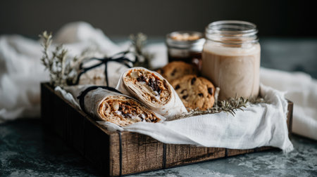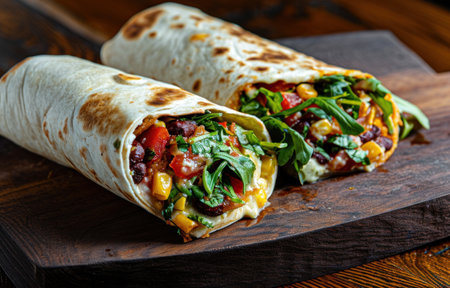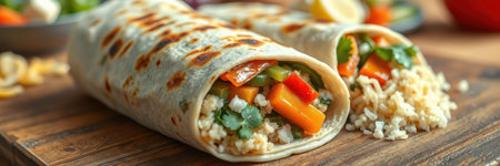 Delicious burritos filled with colorful vegetables and rice showcase a vibrant meal on a rustic wooden table