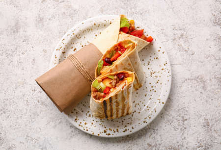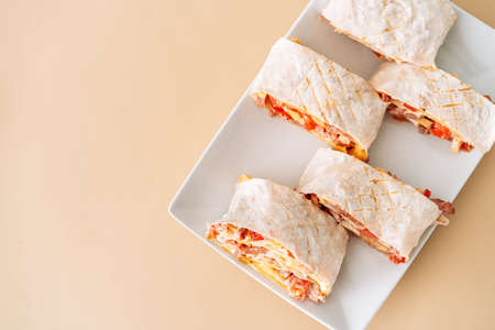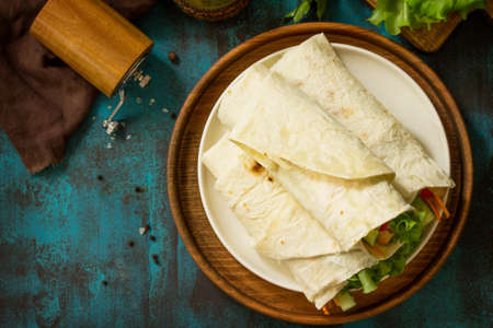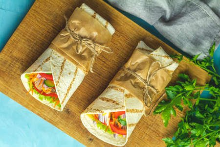 Healthy lunch snack. Tortilla wraps with grilled chicken and fresh vegetables on blue table. Chicken Tortilla, mexican street fast food. Copy space, top view flat lay background.