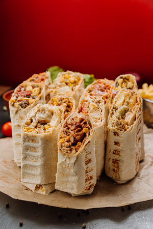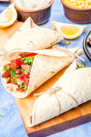 Street fast Mexican food, freshly prepared, homemade sandwiches burrito with beans, beef, corn, peppers, tomatoes and herbs. On the blue background of the concrete stone, close view copy space