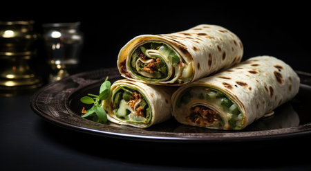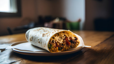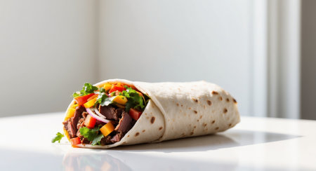 AI Generated. Delicious beef burrito with fresh vegetables wrapped in tortilla