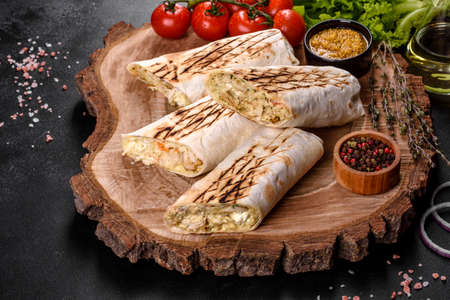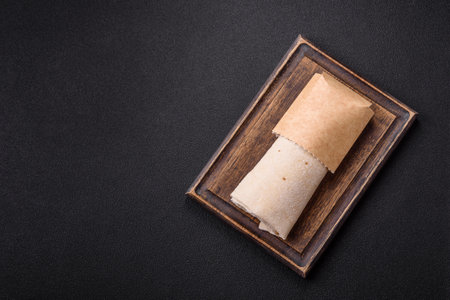 Delicious fresh shawarma with meat and vegetables on a dark concrete table. Fast food, Turkish cuisine