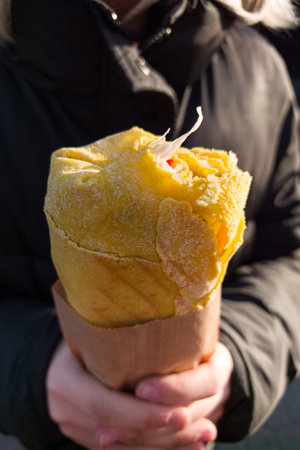 A person holds a vibrant yellow wrap filled with colorful ingredients, standing outdoors under a clear blue sky. The warmth of the sun enhances the joyful experience.