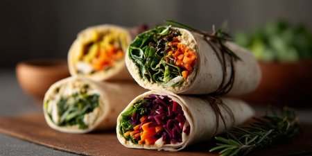 Fresh vegetable wrap with herbs served on a rustic countertop