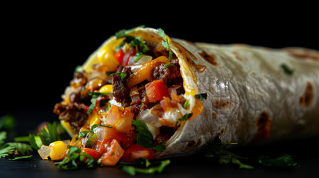 A burrito with meat, cheese, and vegetables is on a black background. The burrito is open and has a lot of toppings