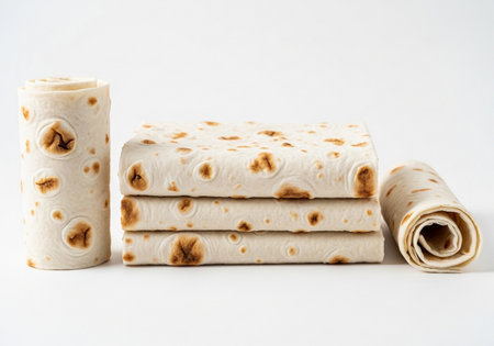 A neat stack of soft, round flatbread wraps lies horizontally, flanked by two rolled wraps on a plain white surface, showcasing their texture and preparation.