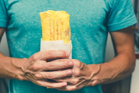 Eating Mexican burrito with chicken, vegetables, pepper and beans. Burrithos takos food in hand. Street fast food on white background