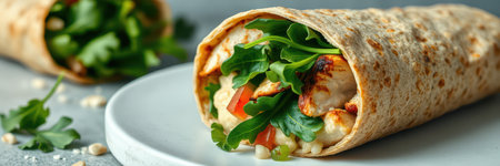 Fresh wrap filled with grilled chicken, vegetables, and greens served on a plate in a well-lit setting