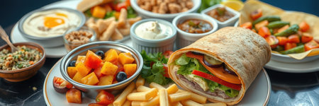 Delicious assortment of fresh food on a table featuring wraps, fruits, and savory dishes
