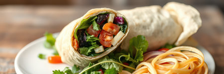 Freshly made wrap with vegetables and herbs served alongside pasta on a white plate in a cozy setting